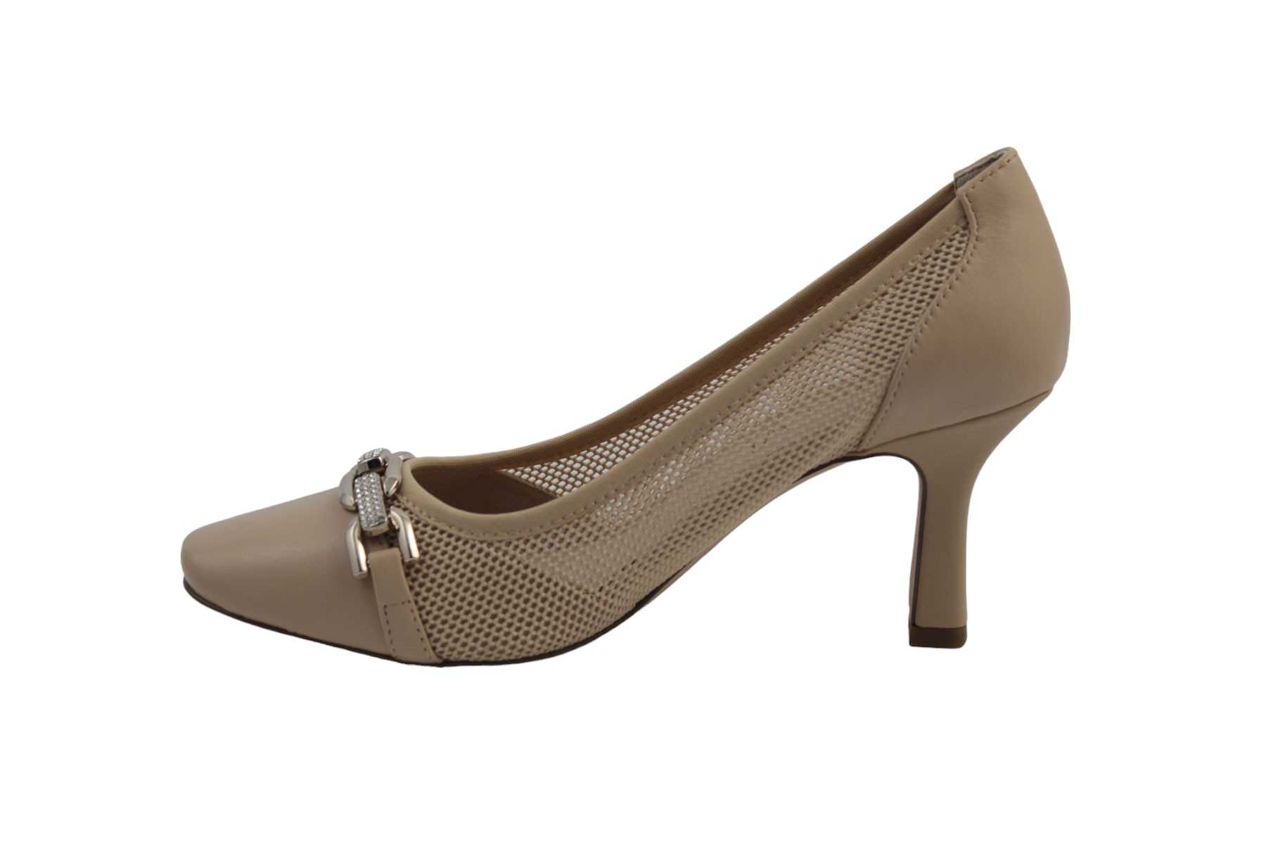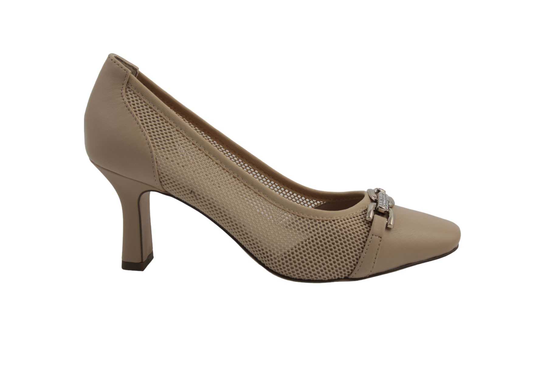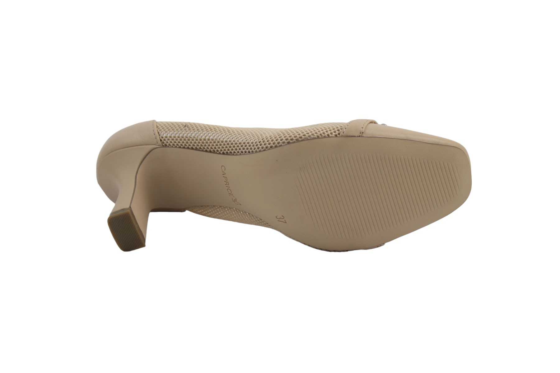 Caprice elegáns női alkalmi cipő magas sarokkal és normál „G” szélességgel. Ez az elegáns női alkalmi cipő tavasz második felétől már viselhető az elegáns megjelenést megkövetelő eseményeken. A cipő külső és belső oldalán lyukacsos szövet betét elősegíti a meleg időben történő megfelelő levegőzést így nem fog belefülledni a cipőbe a lábad. Díszítő elem a cipő orr észén lévő ezüst színű fém láncfonat, a láncokat összekötő elemeken gyöngy utánzatok vannak amelyek megfelelő fényviszonynál csillognak. A kényelmi komfortról a minőségi alapanyagokon kívül a Caprice szabadalmaztatott MEMOTION talpbetéte gondoskodik, a MEMOTION puha memória habja ergonomikusan illeszkedik a talpad formájához. A MEMOTION járás közben tompítja az ütődések erősségét, a cipőt levéve pedig részben visszanyeri eredeti formáját.