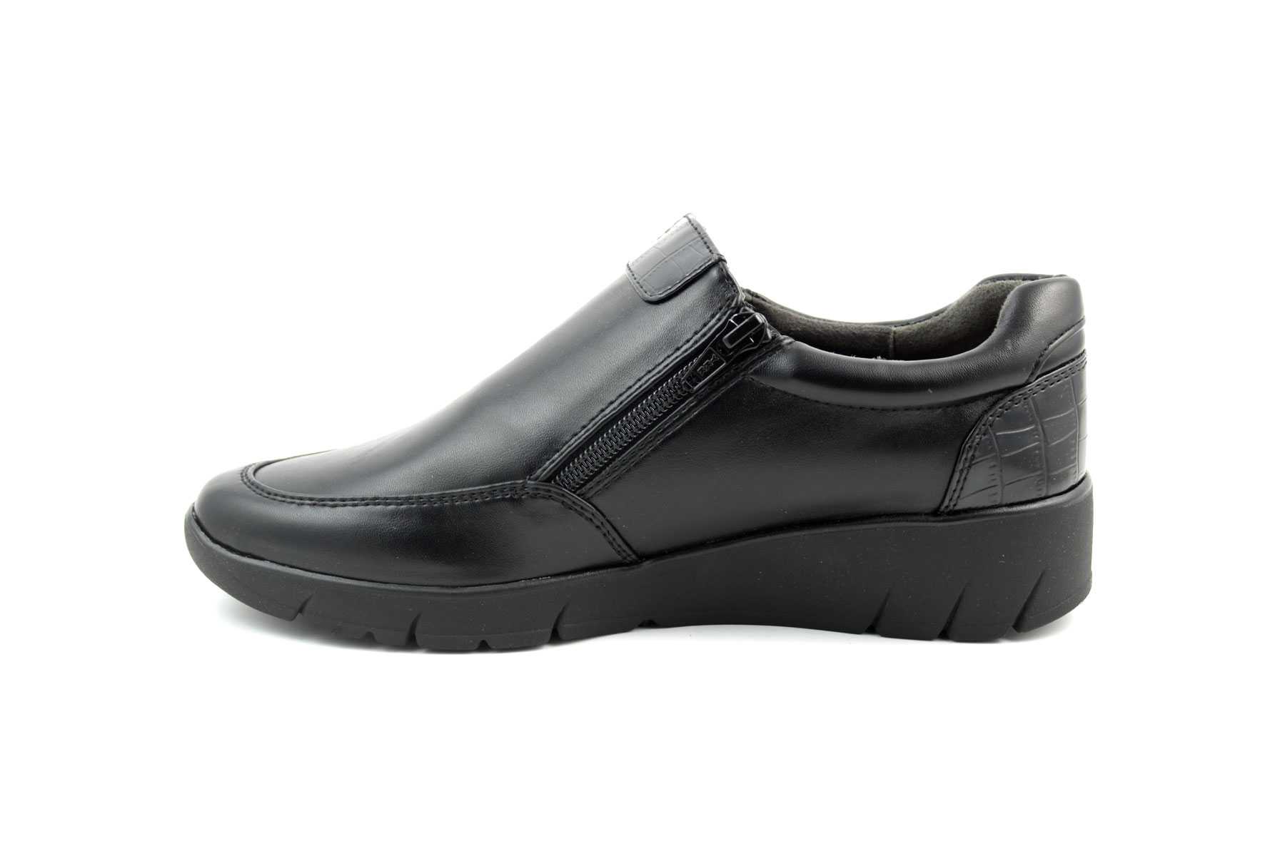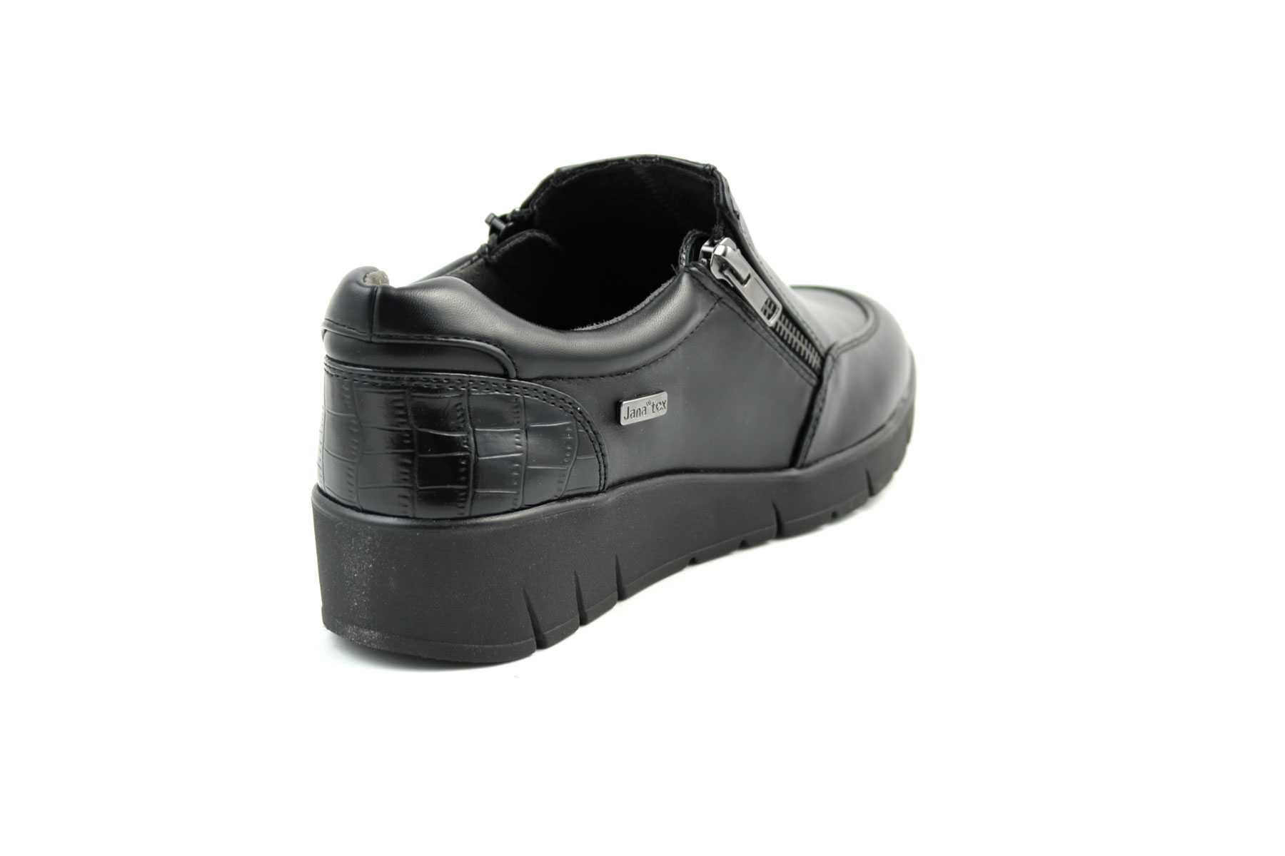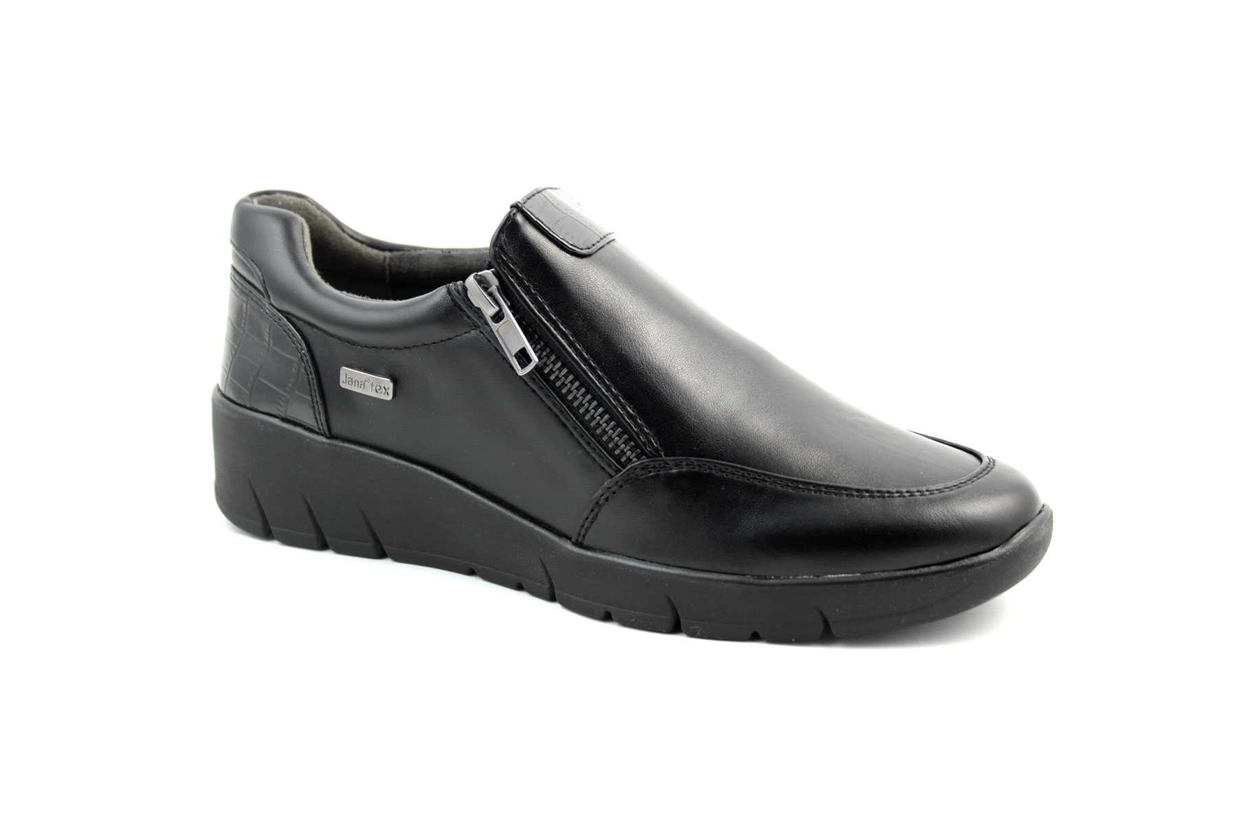 Jana női cipő, cipzáras rögzítéssel és kivehető talpbetéttel. Egy az őszi időszakra ajánlott női cipő amely komfort „H” szélességgel rendelkezik, így az átlagostól szélesebb talpformával rendelkezők számára ideális választás lehet. A cipő rögzítése cipzárral történik amely a külső és belső oldalon is megtalálható, a külső oldalon fém színű cipzár, a belső oldalon a cipő színével összhangban fekete színű cipzár. Kényelmi komfortról a relax fit talpbetét gondoskodik amelynek felülete bársonyos tapintású, a talpbetét egy mozdulattal kivehető a cipőből. A talpbetét a sarok alatt és talpközépen a lábujjak mögötti részen extra párnázással rendelkezik, így a járás közbeni ütődések erőssége tompításra kerül ezzel is védve a lábbeli viselőjének a gerincoszlopát.