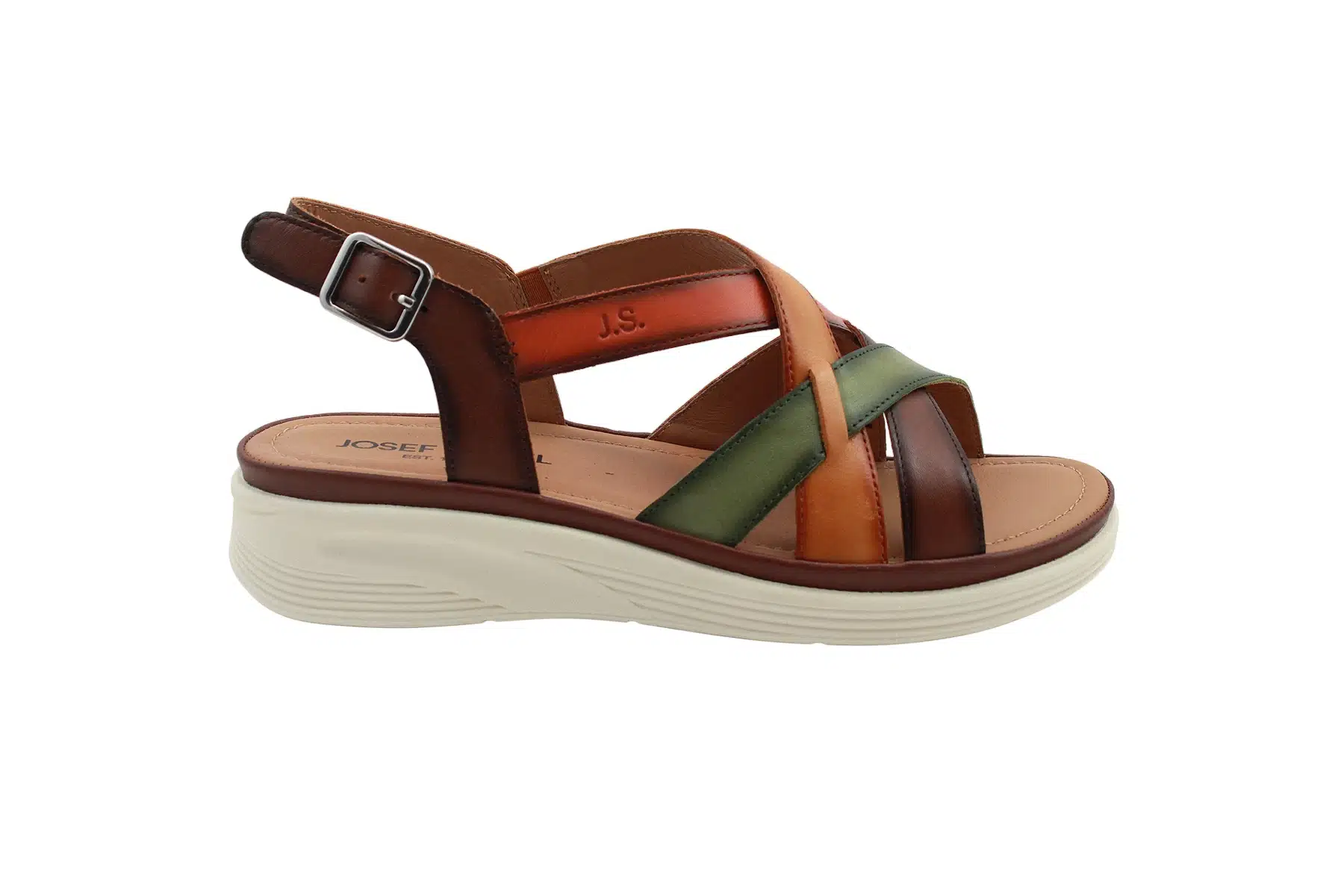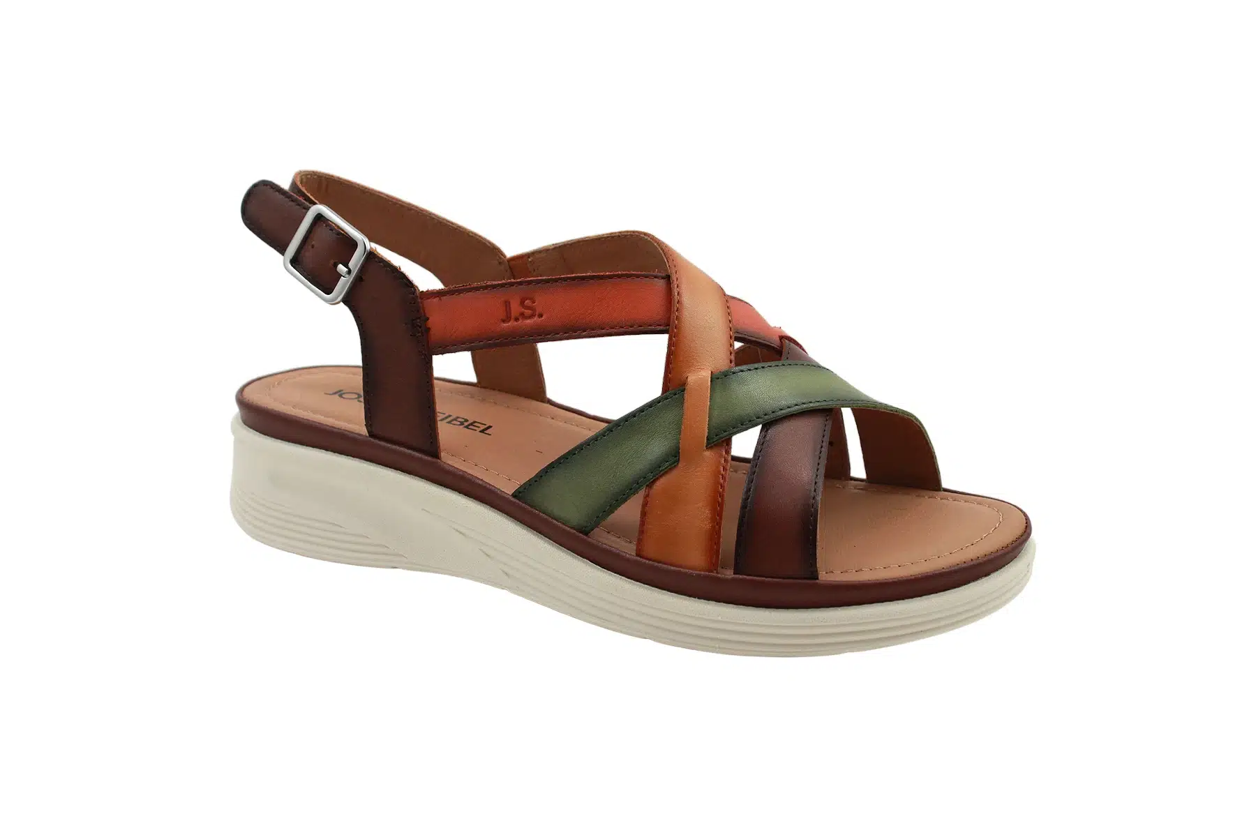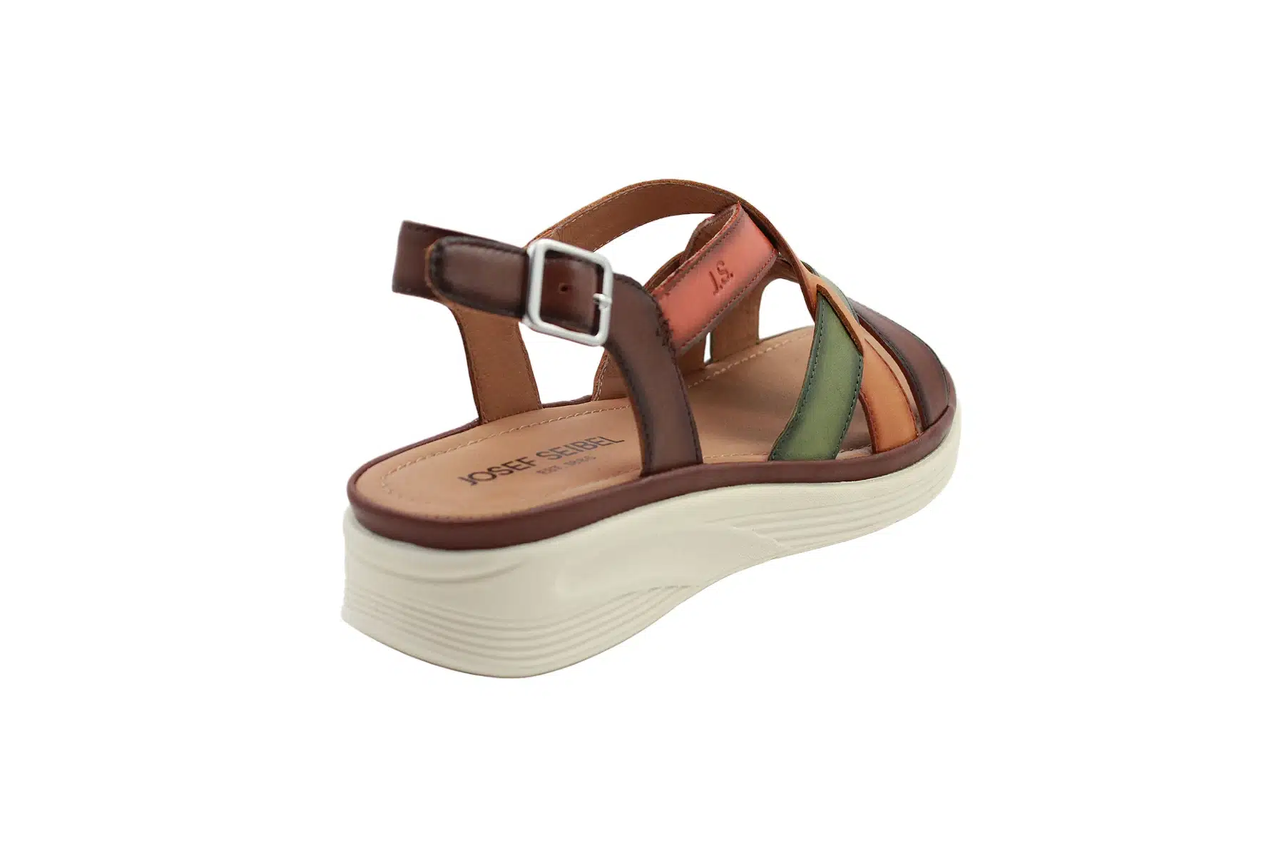 Josef Seibel női nyári utcai szandál, normál „G” bőségmérettel. A szandál sarokpántja tépőzáras, a csat csak dekorációs elem.