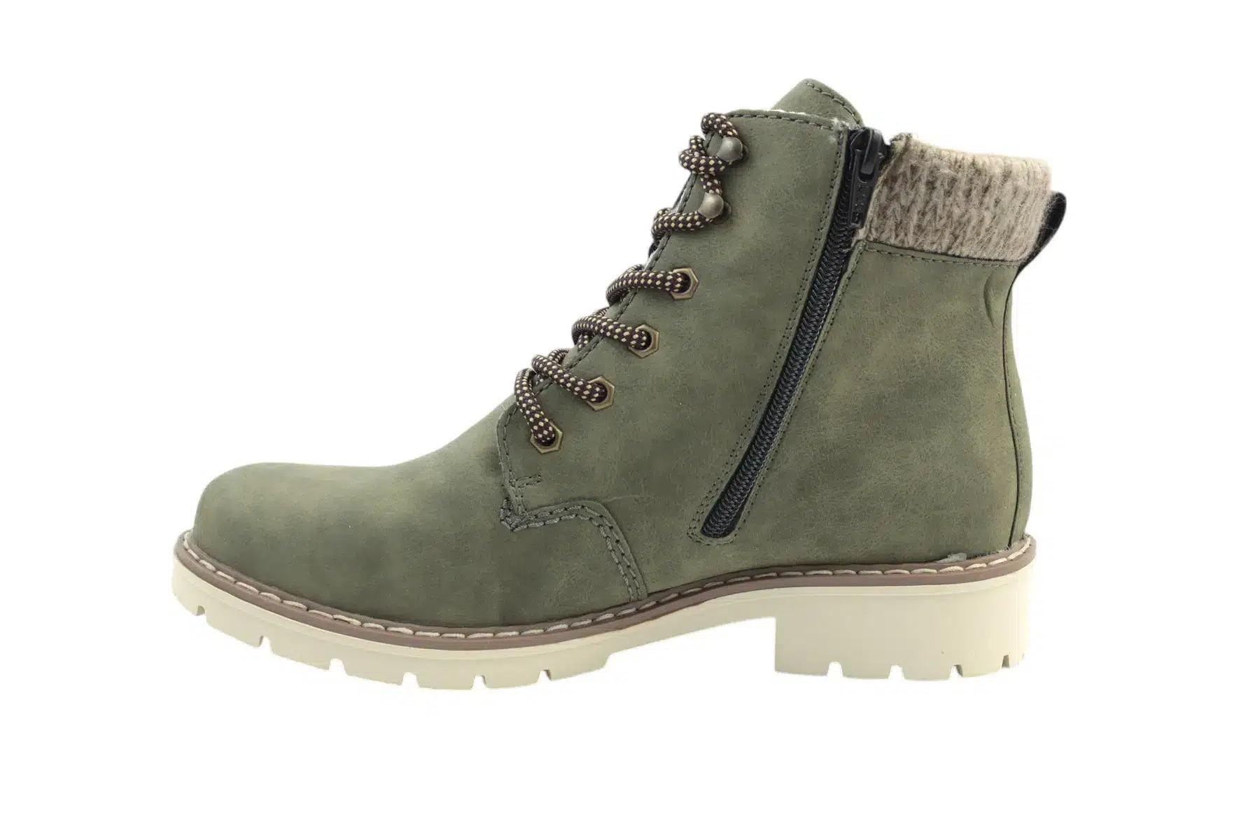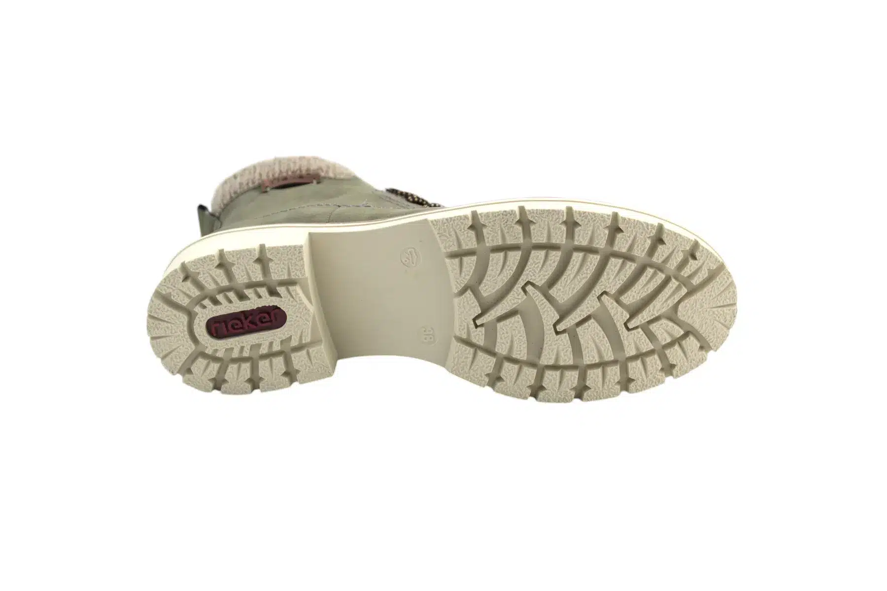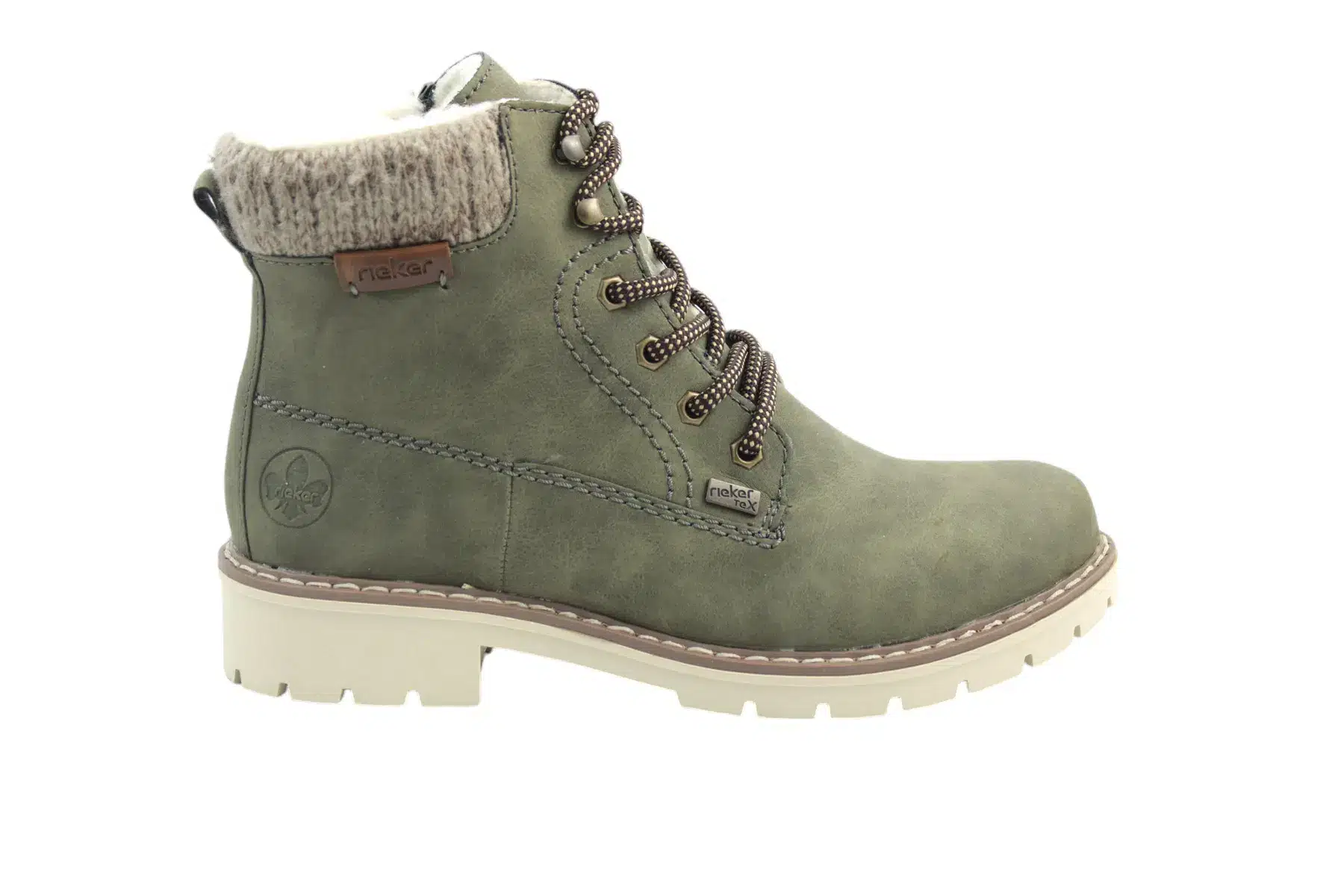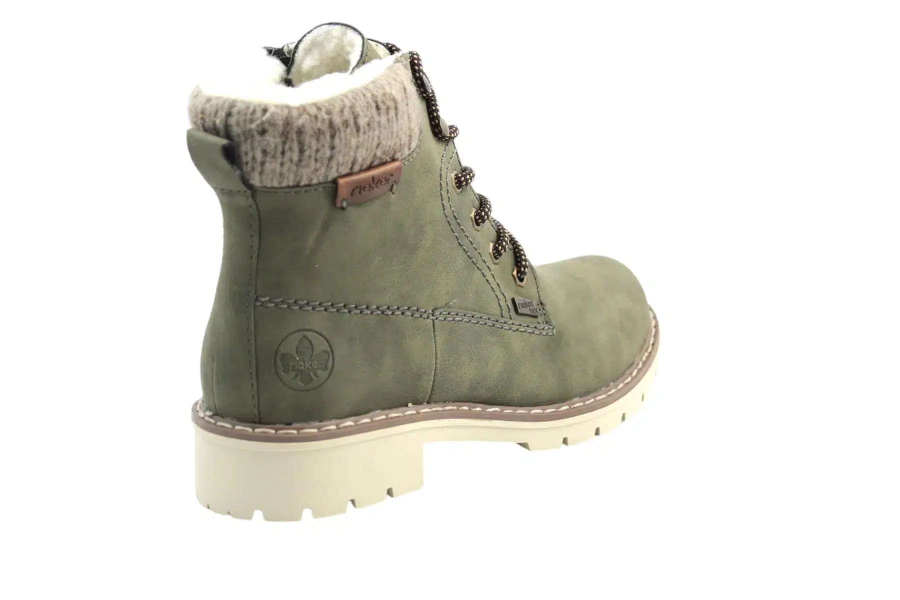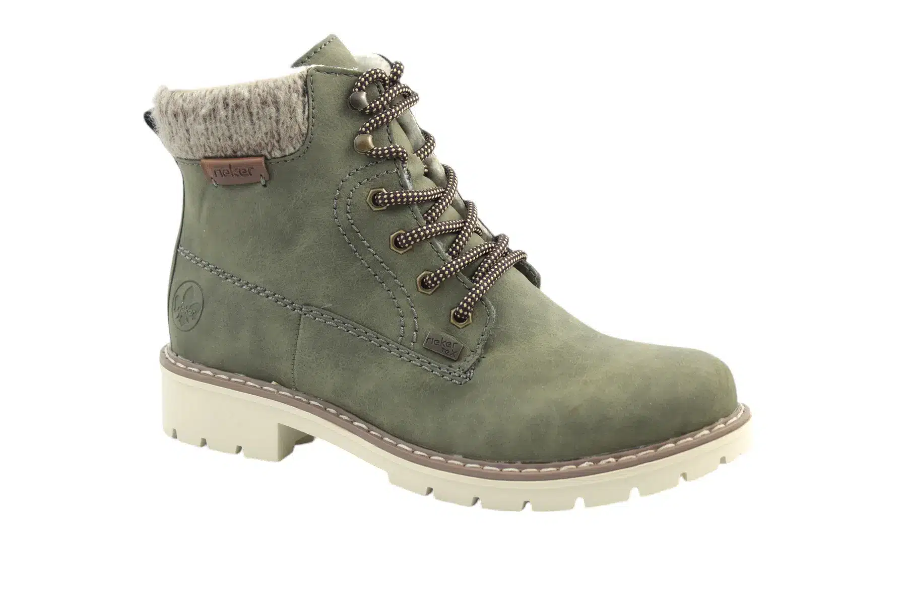 Rieker zöld női bakancs, vízálló RiekerTEX technológiával és vastag meleg béléssel. A hideg téli napokon jól jön ha melegíti a lábát a cipő, így ennek a feltételnek ez az utcai bakancs maradéktalanul megfelel, a másik gyakori elvárás az, hogy a csapadékkal szemben is védelmet biztosítson a lábbeli. Ennek a második elvásárnak is megfelel a bakancs mert a RiekerTEX membrán védelmet biztosít a csapadékkal és a hideg széllel szemben is.